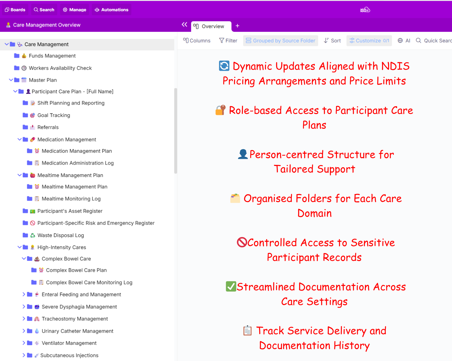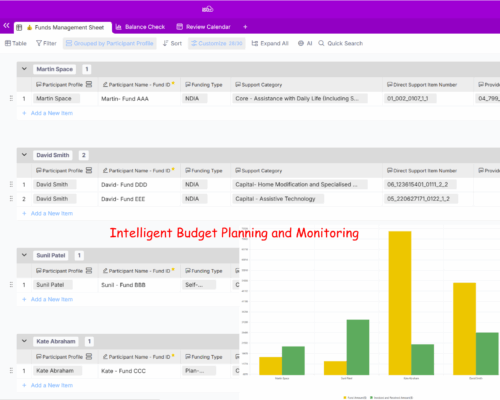 This module helps providers coordinate all aspects of participant care, from budgeting and service planning to worker availability and environmental safety, ensuring care is consistent, personalised, and aligned with participant needs and preferences.