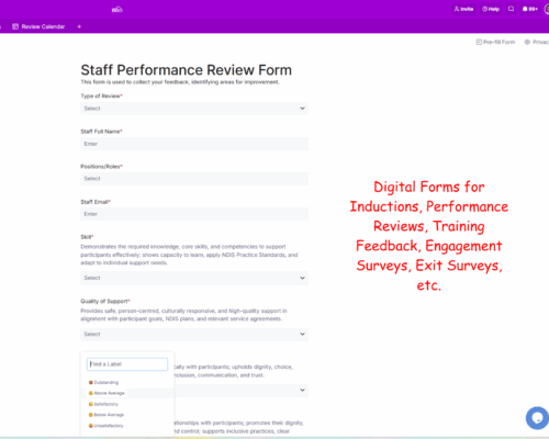 This module helps providers manage recruitment and contracts, onboarding and offboarding, inductions, competency and training, leave and payroll, performance reviews, staff surveys, announcements and more.